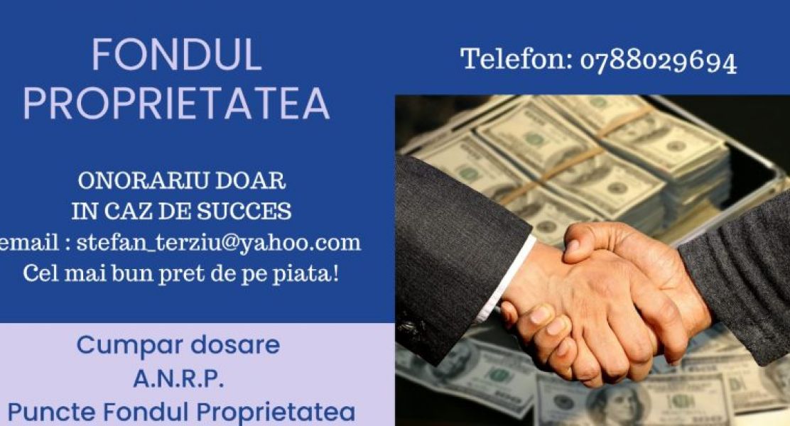 Retrocedari – Legea 10/2001 . Cumparam Dosare ANRP – Telefon – 0788029694 – Fondul Proprietatea – Retrocedari Legea 10/2001 – La cel mai bun pret din piata privind Despagubirile prin echivalent . Totodata va putem reprezenta pentru Emiterea sau Dispozitii din Primarii , Notificari si Restituiri , Dosare ANRP , Fond Funciar , si Sentinte Judecatoresti pentru anul in curs prin Avocati Specializati in Dosare ANRP / Retrocedare – telefon – 0788029694 .