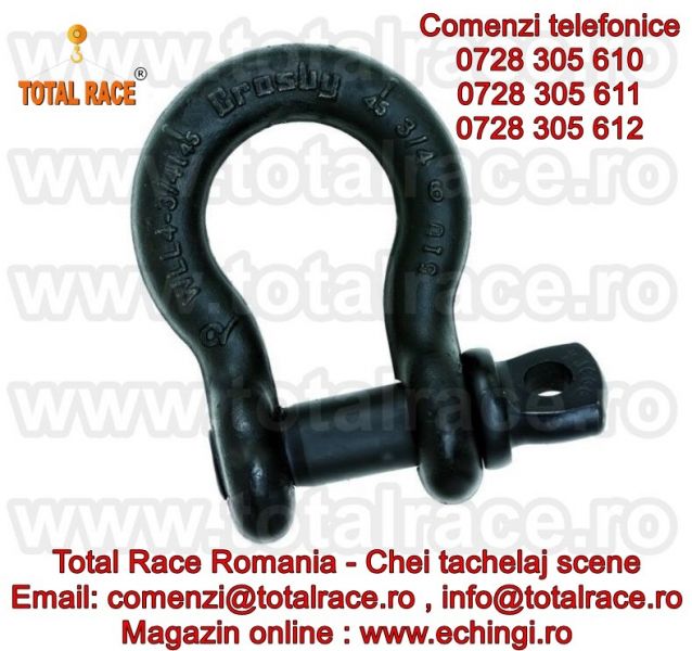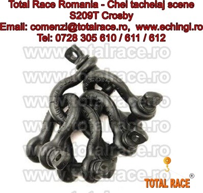 Total Race comercializeaza : chei de tachelaj pentru scena/ teatru / circ / concerte , chei de tachelaj model S 209T tip omega marca Crosby, cheie tachelaj cu bolt filetat . Chei de tachelaj cu capacitati intre 1 tona si 4,75 tone. Gambetii sunt in conformitate cu EN 13889 si indeplinesc cerintele de performanta ale Fed. Spec. RR-C271D tip IVA, grad A, Clasa 2, ASME B30.26. Cheile de tachelaj au factor de siguranta: MBL = 6 x WLL (Sarcina maxima de lucru) , shackles Forjat - Calit si Temperat, cu bolt aliat , material otel aliat , capacitatea stantata permanent.