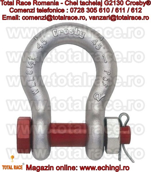 Total Race are in stoc: chei de tachelaj model G 2130 tip omega marca Crosby, cheie tachelaj cu bolt, piulita si stift de blocare , chei tachelaj capacitate intre 0,33 Tone si 150 Tone . Cheile de tachelaj sunt in conformitate cu: EN 13889:2003 si indeplinesc cerintele de performanta ale Fed. Spec. RR-C271D tip IVA, grad A, Clasa 2. Chei de tachelaj cu factor de siguranta: MBL = 6 x WLL (Sarcina maxima de lucru) , cheie tachelaj: Forjat-Calit si Temperat,material otel aliat, galvanizata la cald. Capacitatea stantata permanent pe shackles. Cheile de tachelaj peste capacitate WLL= 25 tone sunt echipate RFID. Cheile de tachelaj Crosby® se livreaza cu certificate de calitate CE de la producator.