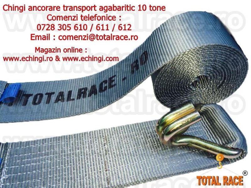 Total Race livreaza din stoc Bucuresti chingi transport marfa agabaritic , chingi ancorare 10 tone latime banda 100 mm clichet Stf 500 daN , chinga ancorare utilaje , chingi arimare 10 tone pentru marfa , sufe de ancorat 10 tone pentru utilaje diverse lungimi, chingi ancorat marfa din poliester 10 tone , chinga 10 tone asigurare transport marfa latime banda ancorare 100 mm. Chingile textile de ancorare 10 tone sunt insotite de Declaratie de Conformitate.