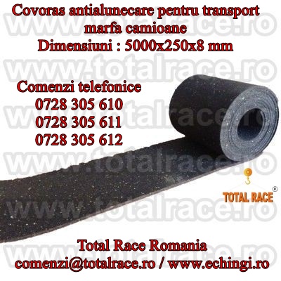 - Total Race Romania comercializeaza covorase / presulete tip rola antialunecare / antiderapante pentru transport marfa , dimensiuni : 5000x250x8mm , producator UTX® Olanda.Covorase antialunecare se utilizeaza pentru transport marfa, covorase antiderapante pentru camioane, covorase antialunecare destinate tranportului de marfa.Covorasele sunt destinate transportului rutier, feroviar, maritim si au rezistenta la frecare foarte mare. Detalii : http://echingi.ro/produse/chingi-ancorare-accesorii/covorase-antialunecare