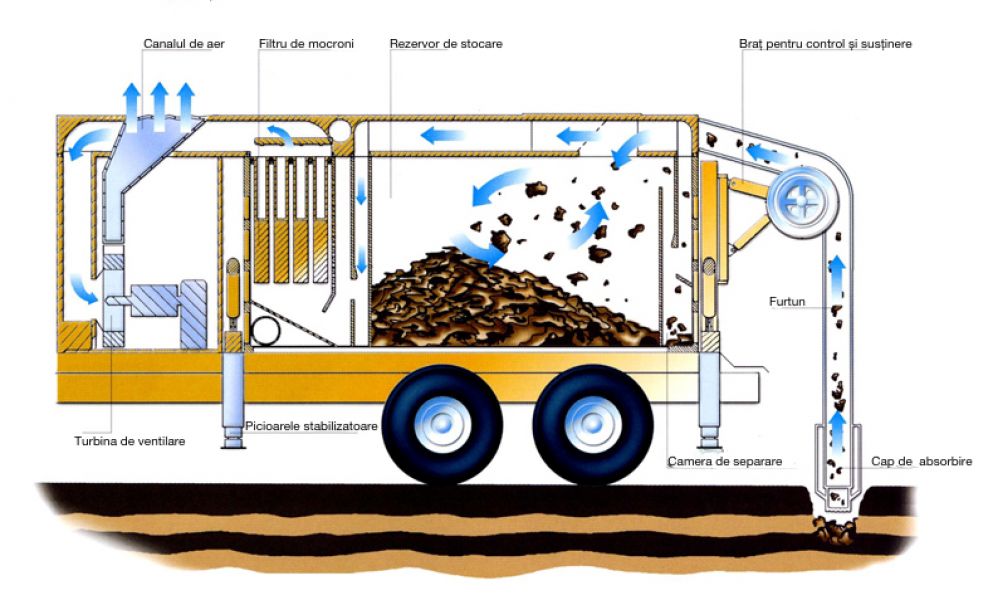 Excavatorul functioneaza pe principiul unui aspirator gigantic care e capabil sa aspire bucati de asfalt, beton, piatra, pietris, cu diametru sub 125mm. Nu formeaza problema nici prezenta namolului, sau apei murdare. Se poate tracta cu rulota sau se poate monta cu stivuitor pe autocamioneta mica (permis B).