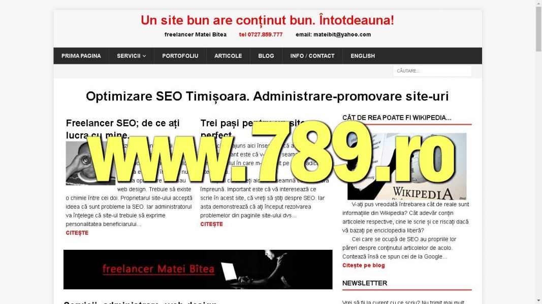 - Optimizare SEO Timisoara servicii web oferite de freelancer. Optimizare site-uri in wordpres, html, magazine online. Vechime in activitatea online din anii 90, din vremea cand internetul era pe dial-up. Ofer servicii de creare site-uri, web-design pe bază de template, realizare si editare de continut nou sau corectie a celui existent. Articole advertoriale, administrare bloguri. Vizitati www.789.ro