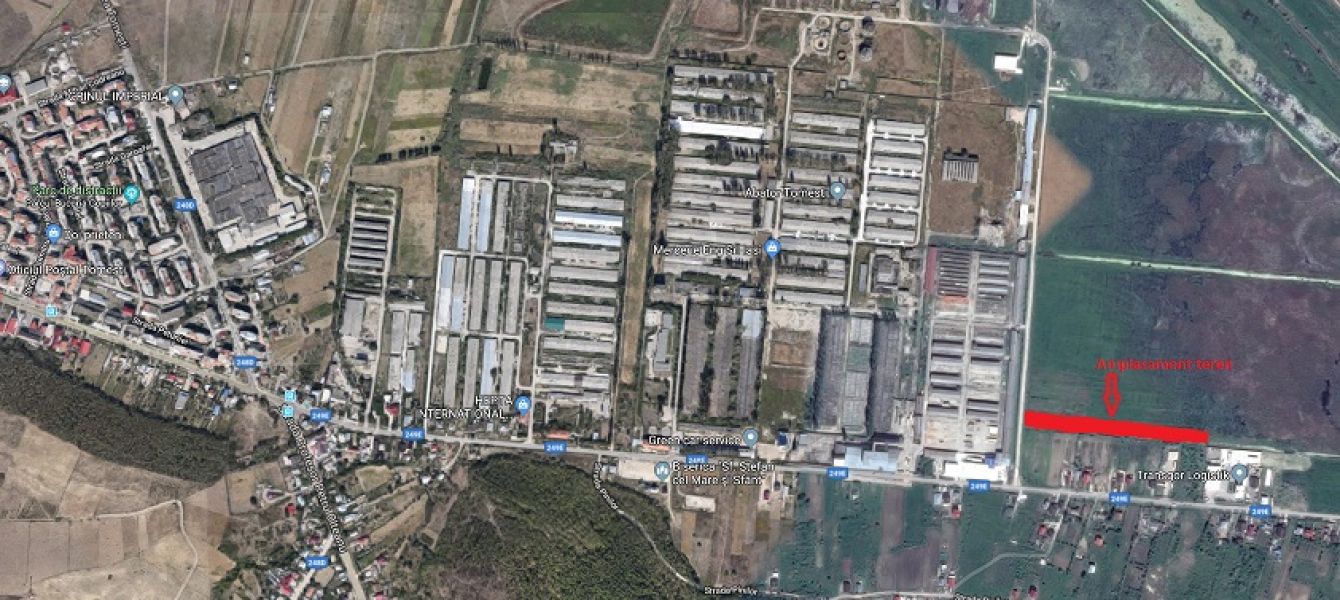 Teren intravilan cu suprafata de 6800 mp situat chiar langa Fiterman Pharma din Tomesti, cu deschidere la drum betonat de 23 ml pe latura din fata si de 21 ml pe latura din spate la alt drum. Distanta pana la drumul judetean este de 104 ml. Toate utilitatile sunt la drumul judetean. Terenul este foarte bun pentru constructii si, conform PUG Tomesti, se pot construi locuinte si cladiri industriale. Tel. 0731.873.348