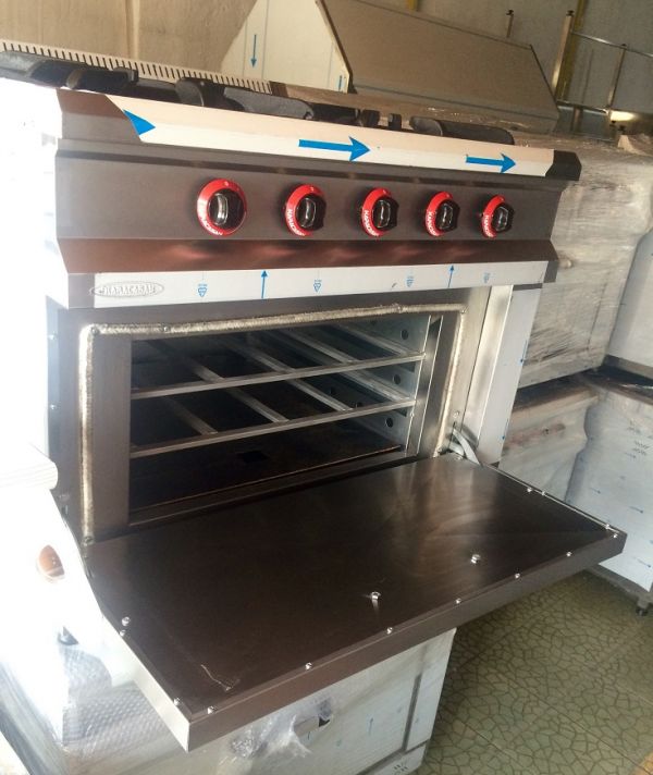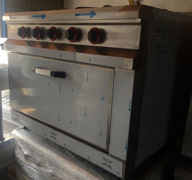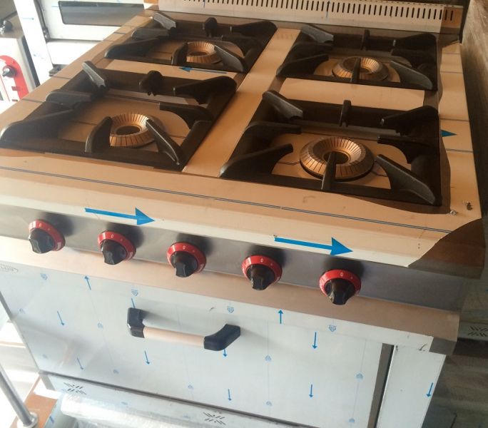 Aragaz profesional 4 ochiuri si cuptor ,Gaz natural sau GPL, dimensiuni 1000x1000x850mm, dimensiuni cuptor 700x650 mm, consum 36.5 kw, 20 Mbar, gratare 40x35cm, flacara diametrul 16 cm, greutate 150 kg, pret 700 euro+TVA.