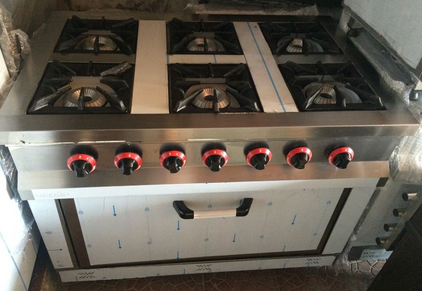 Aragaz profesional inox 6 ochiuri si cuptor ,Gaz natural sau GPL, dimensiuni: 1100x700x850mm, consum 52.5kw, 20 mbar, dimensiuni cuptor 650x400mm, flacara diametrul 12.5 cm, gratare 26x26cm, pret 1000 euro plus Tva.