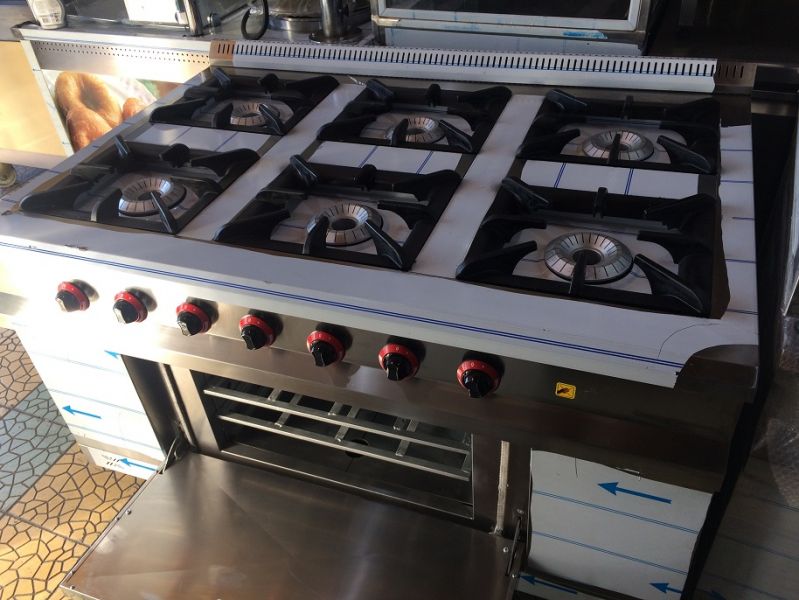 Aragaz profesional inox 6 ochiuri si cuptor, Gaz sau GPL, dimensiuni: 1500x1000x850 mm, dim. cuptor: 660x660 mm, consum 51.5 kw, 20 mbar, greutate 195 kg, diametrul flacara ᴓ 160 mm, gratar= 35x39 cm, pret 1100 Euro plus Tva.