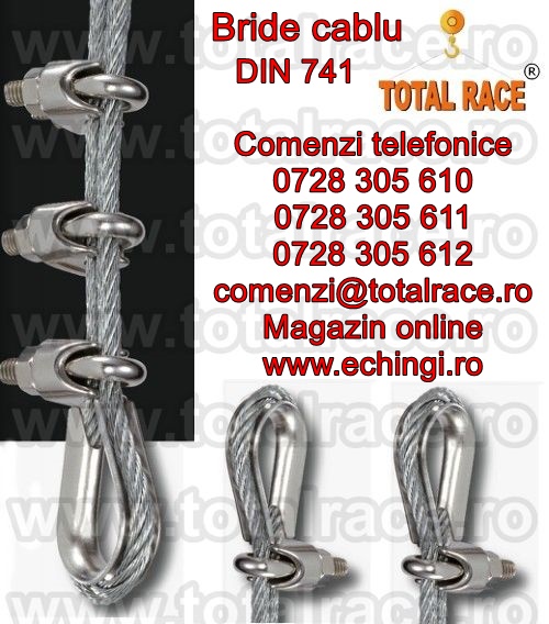 • Total Race Romania comercializeaza din stoc Bucuresti bride sufe cablu DIN 741, bride cablu otel, bride zincate pentru cabluri, bride-cleme de prindere sufe cablu, din otel zincat, pentru cablu otel , clipsuri (bride) tip DIN 741, bride zincat cablu tractiune, accesorii cablu tractiune, gama completa bride cablu pentru cabluri cu diametru 3 mm la 40 mm.