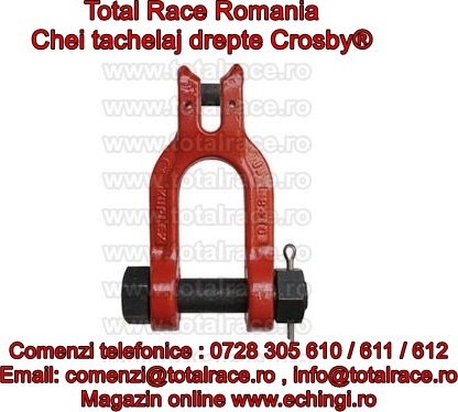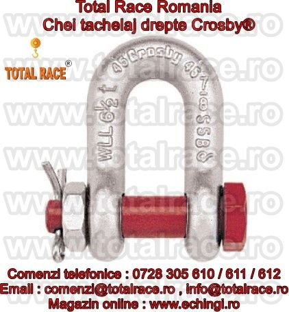 Total Race Romania comercializeaza chei tachelaj drepte Crosby® , cheie tachelaj dreapta cu bolt filetat, gambeti tip lira , shackles Crosby® ce au capacitati cuprinse intre 0.5 Tone si 55 Tone . Cheile de tachelaj sunt in conformitate cu EN 13889:2003 si indeplinesc cerintele de performanta ale Fed. Spec. RR-C271D tip IVA, grad A, Clasa 2. Au factor de siguranta: MBL = 6 x WLL (Sarcina maxima de lucru), material otel aliat , galvanizat la cald ( Forjat- Calit si Temperat ). Capacitatea este stantata permanent pe shackles . Cheile de tachelaj peste capacitate WLL= 25 Tone sunt echipate RFID. Cheile de tachelaj Crosby® se livreaza cu certificate de calitate CE de la producator. Pentru detalii accesati: www.echingi.ro & www.cheitachelaj.ro -