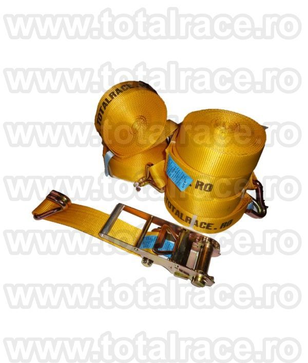 - Total Race Romania livreaza din stoc chinga de ancorare agabaritice, chingi fixare marfa 10 tone , chingi transport agabaritic, chinga de ancorat marfa din doua parti cu capacitate de ancorare 10000 daN ( aprox. 10 tone ) peste incarcatura cu lungime 8 metri , latime banda 75 mm , culoare galbena , carlige diverse modele cu clichet Stf 500 daN . Chingile textile de ancorare 10 tone sunt insotite de Declaratie de Conformitate.