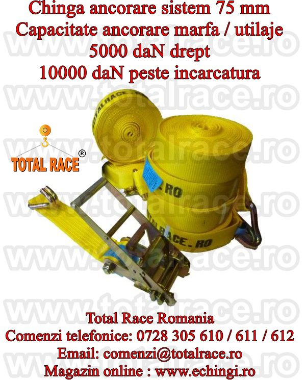 Total Race comercializeaza cu livrare din stoc Bucuresti chingi de ancorare sistem 75 mm cu latime banda 75 mm lungime totala chinga ancorare 12 metri, in conformitate cu EN 12195 – 2 , elongatie < 7 % cu clichet Stf 500 daN, din 2 parti , carlige diverse modele ; din poliester, culoare galbena. Capacitatea de ancorare este Lc 5000 daN drept si Lc 10000 daN peste incarcatura, eticheta ancorare - date de identificare produs , chingi fixare marfa 10 tone, chingi asigurare marfa, chingi legare marfa. .