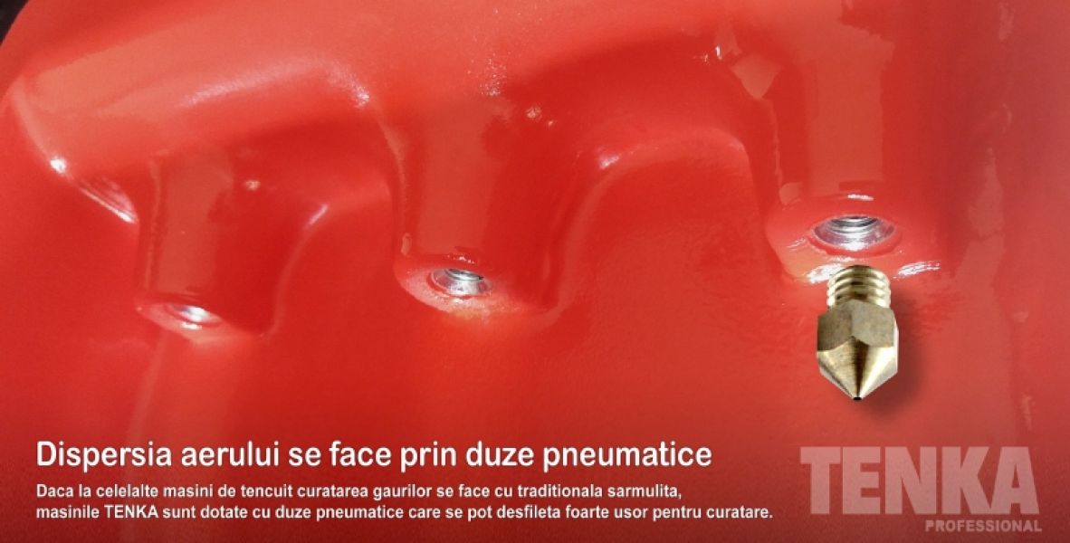 Spre deosebire de pompele de tencuit similare atat cele din China cat si cele din SUA la care dispersia aerului se face prin simple orificii date cu burghiul in metalul galeriei, modelele TENKA au prevazute duze care se pot desfileta foarte usor si curata de ciment sau alte impurtati.