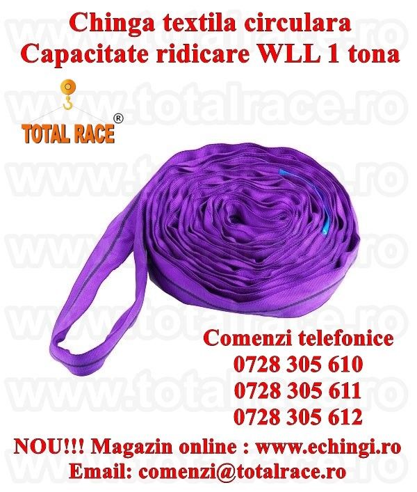 Total Race Romania comercializeaza cu livrare din stoc Bucuresti chinga textila de ridicare circulara capacitate 1 tona lungime utila 5 metri lungime desfasurata 10metri,culoare mov, productie UTX Olanda. Chingile circulare se livreaza insotite de Declaratie de Conformitate, tabel de sarcini si instructiuni de utilizare.Pentru preturi si disponibilitate stoc accesati magazinul nostru online : www.echingi.ro / www.echingi.com/www.chingiridicare.ro