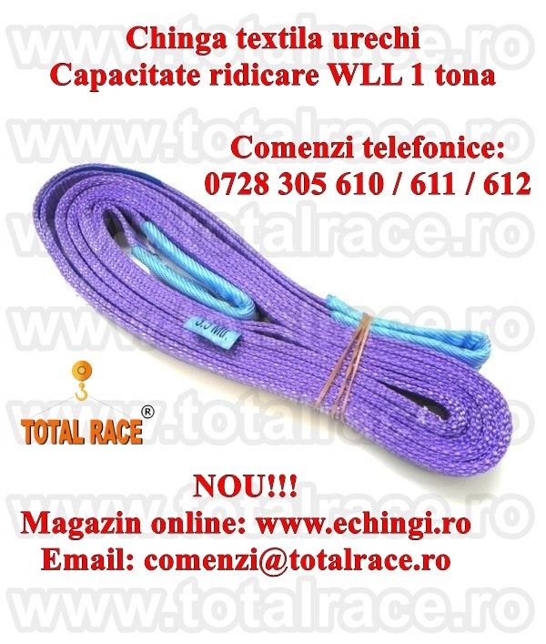 - Total Race Romania comercializeaza cu livrare din stoc Bucuresti sufe ridicare cu urechi capacitate 1 tona, lungime 2 metri, latime de banda 30/50mm, culoare mov, productie UTX Olanda . Chingile textile se livreaza insotite de Declaratie de Conformitate, tabel de sarcini si instructiuni de utilizare. Pentru preturi si disponibilitate stoc accesati magazinul nostru online : www.echingi.ro / www.echingi.com/ www.chingiridicare.ro