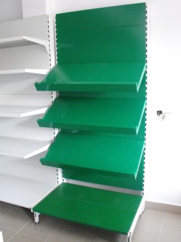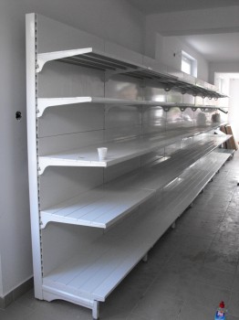 Vand rafturi metalice second hand de perete sau tip gondola pentru autoservire, rafturile pot avea inaltimea de la 1,8m pana la 2,2m, adancimea politelor poate fi 35 / 40 / 45 / 50 / 55 / 60cm. Un metru de raft este alcatuit din baza+patru polite, si include si sina de pret care poate fi rosie, alba, galbena sau albastra. Rafturile arata foarte bine si sunt foarte rezistente.