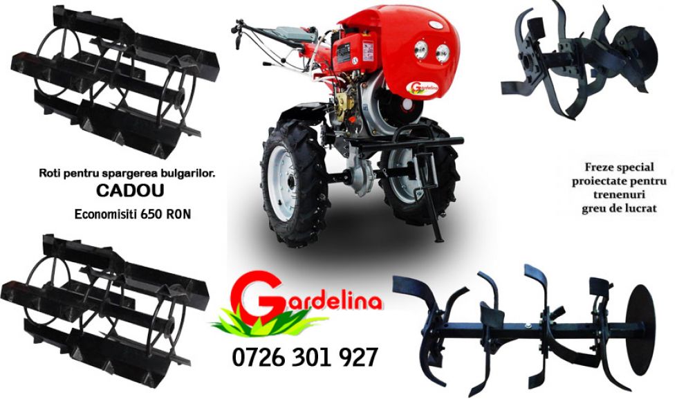 Accesorii atasabile: freze, plug, rarita, cultivator, roti metalice, cauciuc,remorca, roti de transport
