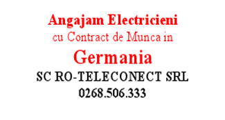 - Angajam electricieni cu contract in Germania, calificati pentru aplicatii/ montaj retele de date si voce in cupru si fibra optica. Se ofera salariu atractiv, cazare masina de servici. Informatii la 0268.506.333
