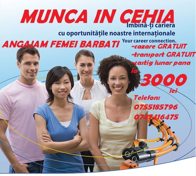 - Angajam FEMEI pentru fabrica de cablaje Cehia, fara experienta,se califica la locul de munca.Conditii bune, salar pana la 3000 lei,contract pe min. 6 luni,cazare si transport din Romania GRATUIT.INSCRIERI PANA IN 21.06.16,plecari in 26.06.16.Telefon: 0755185796.
