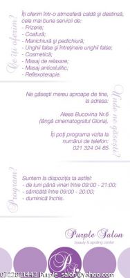 - Purple Slaon Angajeaza : Coafeza , Frizer , Cosmeticiana , Manichiurista , Maseur , se cauta persoane serioase , prezentabile , profesioniste la locul de munca , sociabile 0722821443 1 EUR
