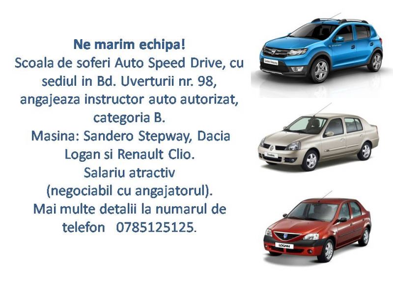 Ne marim echipa! Scoala de soferi Auto Speed Drive angajeaza instructor auto autorizat, categoria B. Masina: Sandero Stepway, Dacia Logan si Renault Clio.