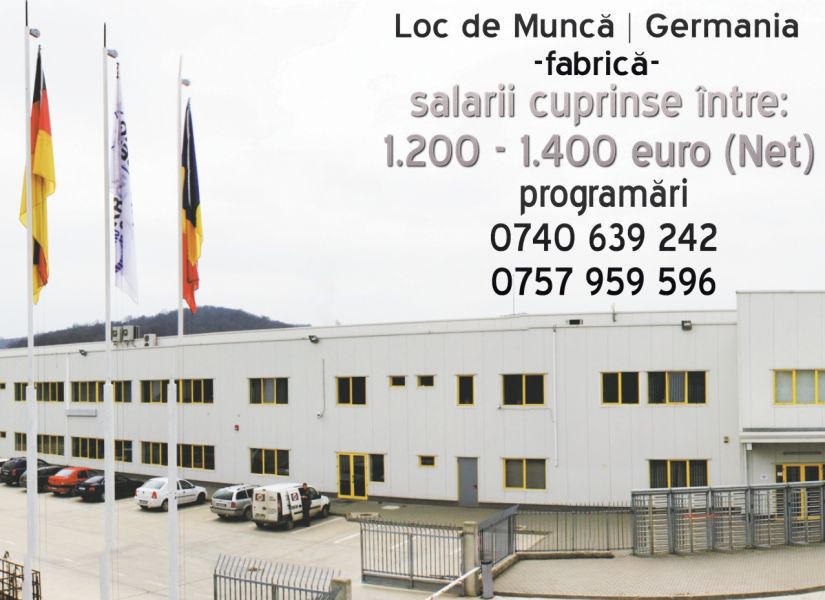 - Oferta de munca in fabricile de ambalat cabluri auto si de calculator, in Germania. Se accepta cupluri sau grupuri de persoane. Salariul 1400 euro/luna, cazarea si o masa/zi este asigurata de catre angajatori. Pentru mai multe informatii si inscrieri va asteptam de luni pana vineri, orele 9:00-17:00