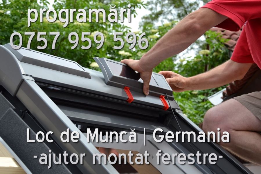 - Angajari in Germania, ca muncitor necalificat, pentru ajutor montat ferestre. Se asigura cazarea si salariul de 1400 euro net/luna si cazarea gratuita. Se cere permis categoria B. Pentru informatii sunati la numarul afisat. Pentru informatii si inscrieri va asteptam de luni pana vineri, orele 9:00-17:00 la nr de tel: 0757959596.