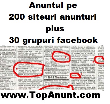 Inscriem anuntul in 200 siteuri de anunturi si 30 grupuri facebook de anunturi cu www.TopAnunt.com