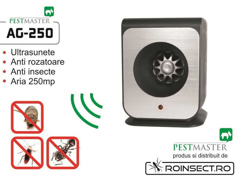 - Aparatul PestmasterAG250 este un aparat pe baza de ultrasunete, non toxic si a fost conceput sa creeze discomfort daunatorilor si sa ii indeparteze de zona protejata de acesta. Pentru comenzi puteti suna la numarul de telefon:0758101503 sau http://www.roinsect.ro/pesticide/aparate-anti-daunatori/5
