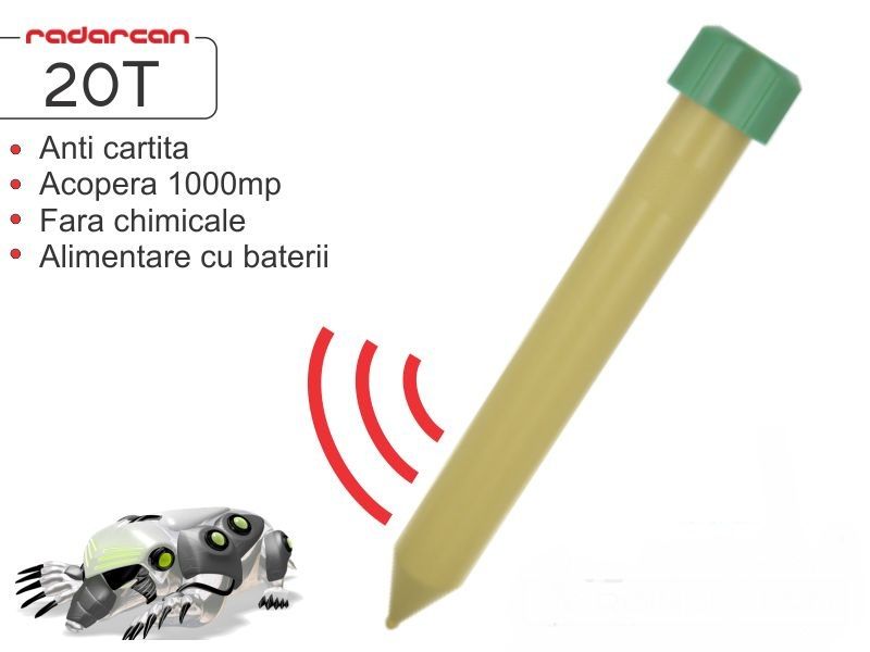 Aparatul Radarcan20T(1000mp)este un aparat pe baza de vibratii ce vine sa iti apare gradina de zarzavaturi,serele ,livezile,dedaunatorii ce pot crea pagube. Puteti comanda la numarul de telefon:0758101503 sau http://www.anticartite.ro/