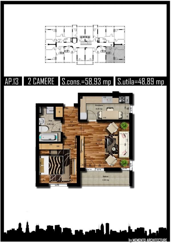 Visezi sa ai locuinta ta? Noi iti putem oferii un Apartament cu 2 camere, 49 mp utili, decomandat, finisat cu gresie, faianta, parchet si usi de interior la alegerea dvs., echipat cu centrala proprie, calorifere, prize, intrerupatoare, tamplarie PVC cu geam termopan si baie utilata complet. Apartamentul se afla in bloc nou, situat pe strada Rezervelor , nr. 79, langa statia de R.A.T.B. 178/138. Constructia este formata din D+P+7E, construita integral din caramida, atat exterior cat si interior, cu structura de beton si izolatie de polistiren de 10 cm.