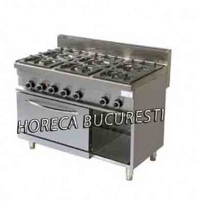 Masina de gatit cu 6 focuri si cuptor GN1/1, arzatoare cu flacara dubla, flacara pilot, valva de siguranta cu termocupla; cuptor cu aprindere piezoelectrica, flacara pilot, termocupla si termostat, alimentare gaz, consum 6x6 kw+6 kw, greutate 140 kg, dim. 1200x700x900 mm; Pret 1752 Euro + TVA; 0214 109 093/0721 922 902/0732 702 331/ 0720 852 570; vanzari@horeca-bucuresti.ro; http://www.horeca-bucuresti.ro/