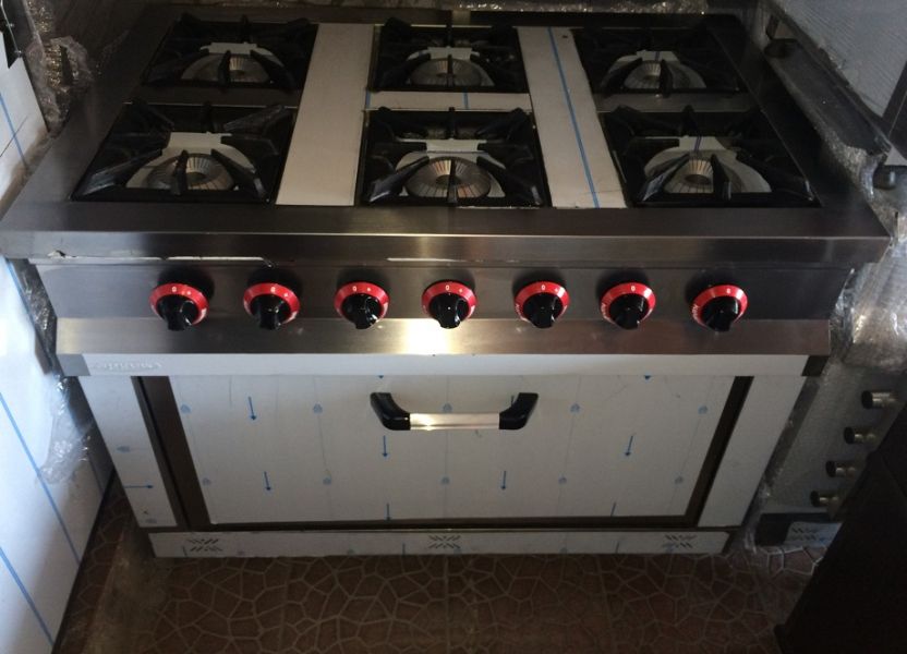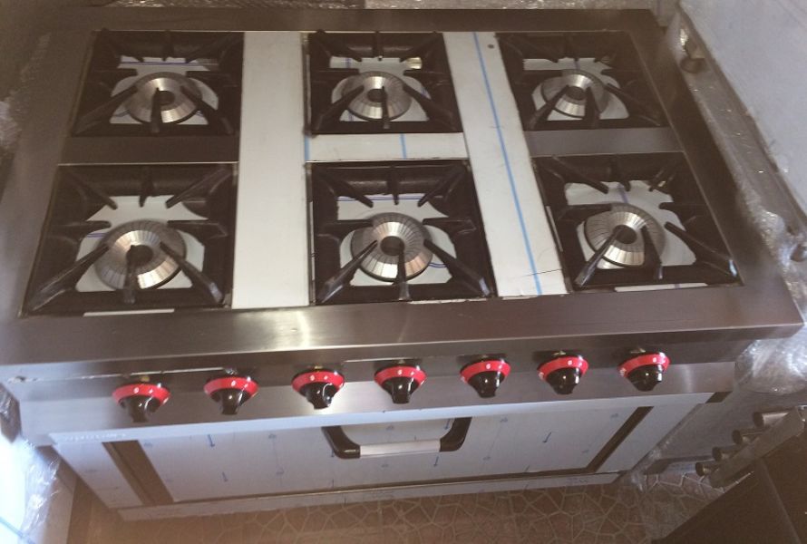 Aragaz profesional inox 6 ochiuri si cuptor ,Gaz natural sau GPL, dimensiuni: 1100x700x850mm, consum 52.5kw, 20 mbar, dimensiuni cuptor 650x400mm, flacara diametrul 12.5 cm, gratare 26x26cm, pret 1000 euro plus Tva.