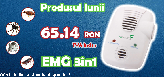 Pestmaster EMG 3 in 1 este un aparat creat sa alunge daunatorii casei cu ajutorul undelor electromagnetice si a ultrasunetelor emise prin boxa speciala ce acopera o suprafata de200mp. Puteti comanda la nr de telefon: 0758101503 sau www.ultrasuneteaparate.ro