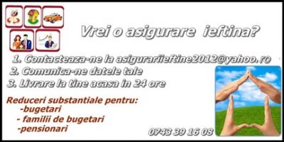 - Incheiem cele mai ieftine asigurari din tara. Nu o spunem noi, ci toata lumea o stie. Contacteaza-ne pe email la asigurariieftine2012@yahoo.com , iar in 30 de minute asigurarea va fi incheiata sau la tel 0743391608 si daca esti din Iasi in 24 de ore asigurarea ajunge direct la dumneavoastra acasa. Suntem alaturi de dumneavoastra cu cea mai ieftina asigurare.