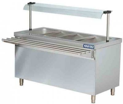 Modul Bain Marie cu suport neutru deschis, constructie inox AISI 304 18/10, capacitate 3xGN 1/1, adancime 150mm, suport impinge tava 3 bare x Ø30mm, suprastructura din inox cu polita de sticla, temperatura de lucru +30…+90 grade, termostat de control, rezistentele imbracate in silicon, robinet de scurgere, picioare reglabile, alimentare 220V, putere 2x0,8Kw, dimensiuni 1150x700/1000x850/1245mm. Gastronoamele nu intra in pret. Cod: 250164 Pret 1107 Euro. Website: www.echipamentehoreca.ro , Tel: 0731 347 077