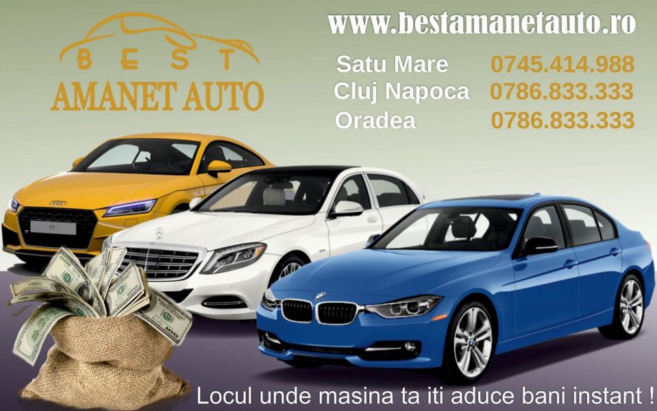 - La Best Amanet Auto poti obtine un imprumut rapid si fara a avea avea nevoie de acte doveditoare de venit prin amanetarea autoturismului personal. Iti facem evaluarea gratuit si putem negocia suma imprumutata si iti asiguram cele mai bune comisioane din regiune . Poti venii la unul din punctele noastre de lucru din Satu Mare, Oradea sau Cluj Napoca ori ne poti contacta daca esti din regiune si consultantii nostri vor venii la tine pentru evaluare si negociere