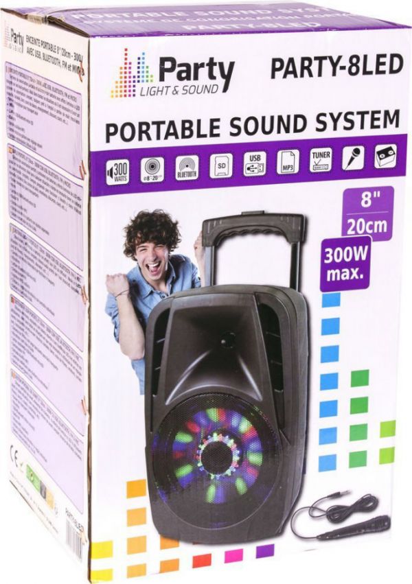 Bucura-te de muzica preferata, oriunde ai merge. Boxa portabila are un design modern cu o cutie clasica prevazuta cu maner retractabil , fiind luminata de LED-uri ce isi schimba continu culoarea. Aceasta are acumulator incorporat ce ii ofera o autonomie de 5-9 ore. Boxa amplifica sunetul redat fie de pe telefonul mobil fie de pe cardul SD sau USB, are microfon si dispune de radio FM cu cautare automata.