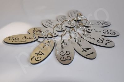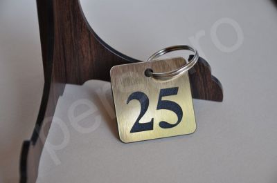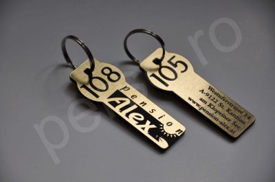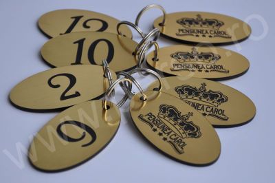 - Confectionam brelocuri gravate pentru hoteluri, vile si pensiuni. Va punem la dispozitie o gama variata de brelocuri gravate pentru camere, cu sigla hotelului, cu numere sau cu orice alte informatii. Brelocurile pot fi aurii, argintii, bronz sau alte culori, din material plastic sau metalic. Brelocurile personalizate sunt prevazute cu inel metalic pentru prinderea cheilor. Puteti comanda brelocuri ovale, sau brelocuri personalizate patrate, dreptunghiulare, sau de alta forma. Brelocurile se personalizeaza prin gravura laser sau mecanica, inscriptionarea fiind permanenta. Marimea brelocuri este la alegerea dvs. Primim comenzi de brelocuri personalizate, brelocuri gravate, brelocuri metalice gravate, in orice cantitate.Preturile se stabilesc pentru fiecare comanda in parte. Pentru orice alte informatii va rugam sa ne contactati: office@perso.ro