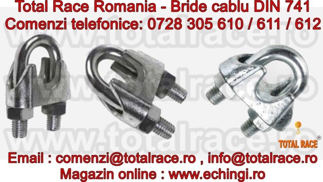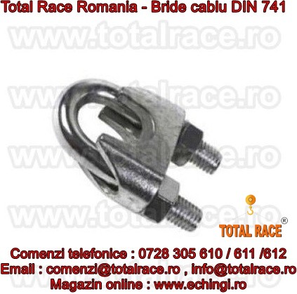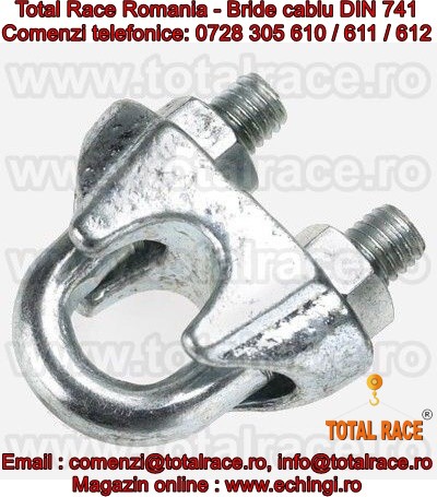 Total Race Romania comercializeaza bride cablu turnate DIN741, bride cablu otel, bride zincate pentru cabluri cu diametru 3 mm la 40 mm , bride metalice de strangere cablu , bride fixare cablu , brida zincata pentru cabluri cu diametru de la Ø3 la Ø40, bride-cleme de prindere cablu, din otel zincat, pentru cablu otel , clipsuri (bride) tip DIN 741, bride zincat cablu tractiune, accesorii cablu tractiune, gama completa bride cablu. Puntea bridei este turnata iar surubul U din otel slab-aliat ,