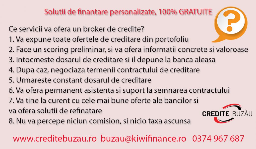 - Broker de credite, francizat Kiwi Finance, va ofera cele mai bune solutii financiare, complete si gratuite. Economisiti timp, fara drumuri la banci, intocmim dosarul de credit si vi-l sustinem in banca. Fara taxe ascunse, simplu si rapid, obtineti sfaturi profesionale. Credite ipotecare, de nevoi personale, refinantare, orice tip de credit. Colaboram cu majoritatea institutiilor bancare si IFN-uri. Mai multe informatii pe site creditebuzau . ro, sau la numere de telefon: 0374 967 687 sau 0765 033 989. www.creditebuzau.ro