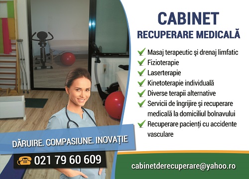 - Cabinet de recuperare medicala, kinetoterapie, fizioterapie, masaj. tratamentul durerilor de spate precum si a diverselor afectiuni de natura ortopedicotraumatica sau neurologica. recuperare accidente vasculare precum si ingrijire si tratament de specialitate la domiciliu bolnavului; 0724817329