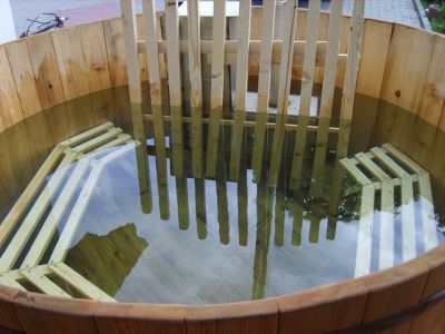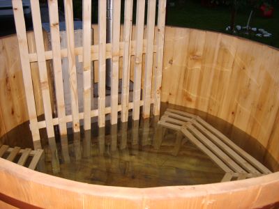 Cada, cada exterior, cada din lemn, cada incalzita, jakuzi din lemn, ciubere, tocitoare, sauna, outdoor sauna, fűthető cseber, dézsa. Latime 2m, Inaltime 1,30 . Soba inox .
