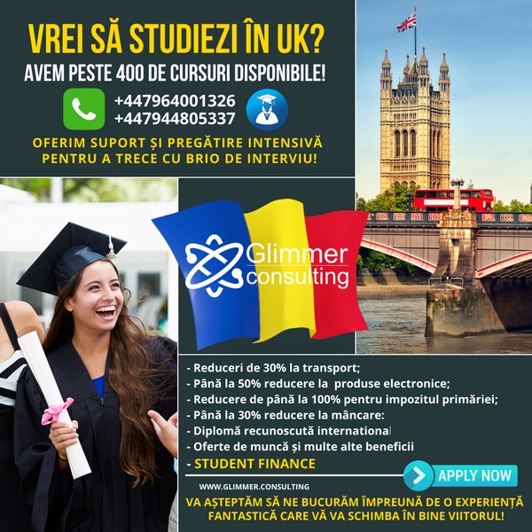 - Daca alegi să studiezi in UK, viata ta se indreapta catre un viitor mai bun. Poti primii pana la 22.000 de pounds anual de la STUDENT FINANCE. Locurile sunt limitate, nu mai sta pe ganduri. Colaborăm cu diferite Universitati din UK si avem disponibile peste 400 de cursuri. Oferim suport și pregatire intensiva pentru a trece cu brio de interviu! Disponibil pentru cei care au varste cuprinse intre 18-60 de ani. Calea ta catre o educatie globala incepe acum, cu Glimmer Consulting. Te așteptam sa ne bucuram impreuna de o experiența fantastica care iti va schimba in bine viitorul. Corona Virus ne forteaza sa stam in casa! Noi insa ne continuam activitatea ONLINE. Nu trebuie sa va prezentati la facultate pentru a sustine interviul de admitere. Inscrierile la cursuri se fac prin intermediul interviurilor ONLINE! Nu mai sta pe ganduri.