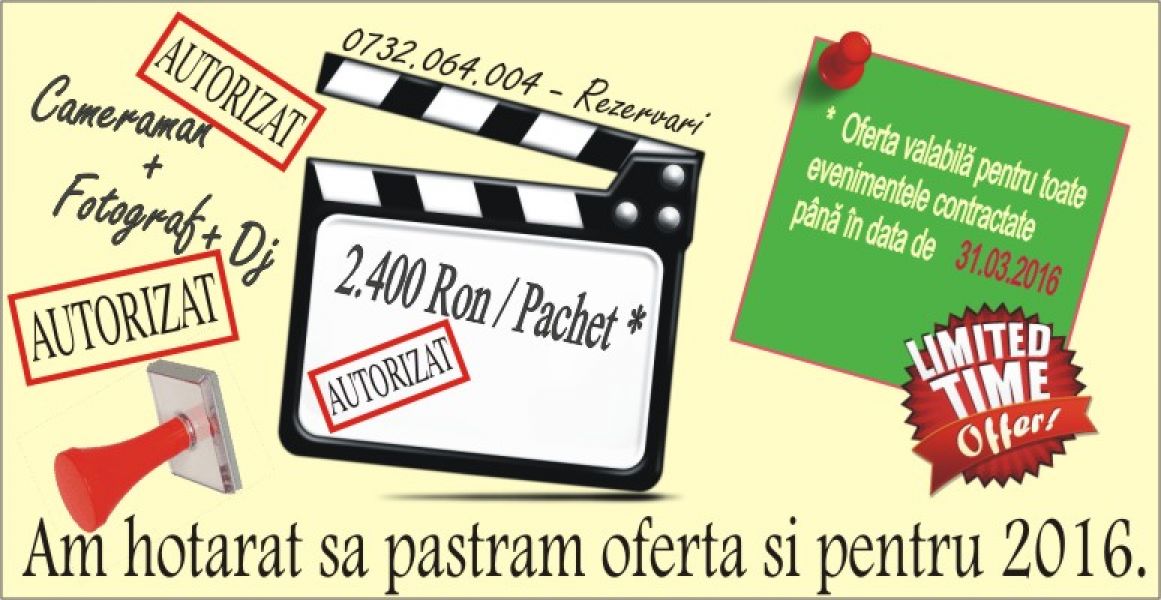 - Doar pana la 31 martie 2016 mai poti contracta servicii video-foto-dj la doar 2400 lei !!! In timp ce altii cresc preturile, noi ... crestem calitatea, pastrand si in 2016 acelasi pret pentru pachetul video-foto-dj ca si in 2015. Acceseaza link-ul http:--www.video-foto-dj.ro-oferta.html si vezi propunerea noastra pentru o petrecere reusita! Tu distreaza-te si lasa-ne pe noi sa-ti asiguram tie si invitatilor tai buna dispozitie si amintiri ale unor momente unice