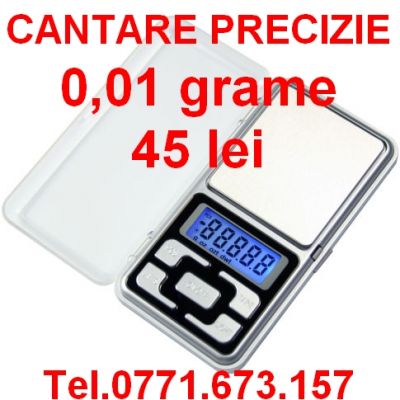 - Cantare electronice de inalta precizie. Precizie: 0,01 grame Greutate maxima cantarita: 100 grame Pret: 45 lei Livrari rapide in toata tara: Tel.0771.673.157