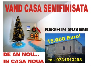 - Vand casa in Reghin-Suseni, constructie noua, 2012, din BCA. 3 camere, bucatarie si baie; termopane, semifinisata la 15.000euro sau cu finisaje Centrala trermica pe lemne, calorifere, fantana, hidrofor, decantor si bransament la curent la doar 25.000 euro. Accept unele variante cu terenuri, garsoniera sau auto si minim 10-15.000euro cash, posibilitate si cateva rate!!