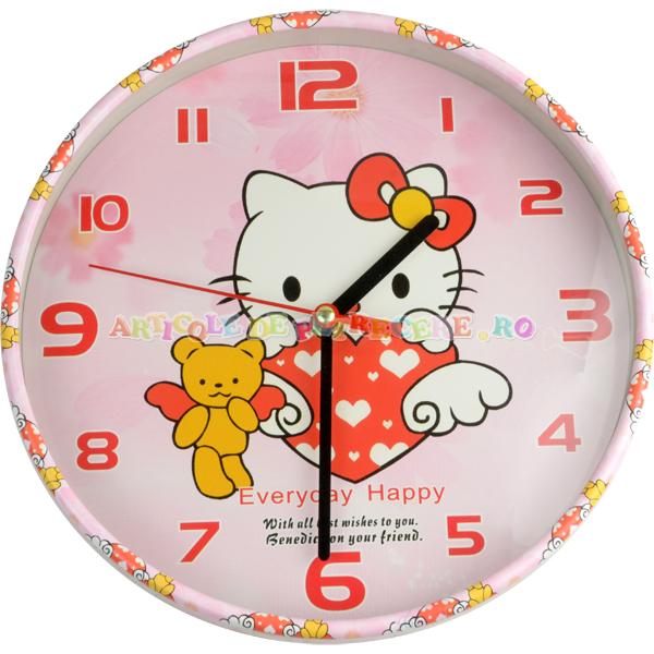 Ceas pentru perete model Hello Kitty, din material plastic, 24 cm diametru. Este un ceas foarte frumos si elegant care se potriveste perfect in camera unei fetite – www.articoledepetrecere.ro