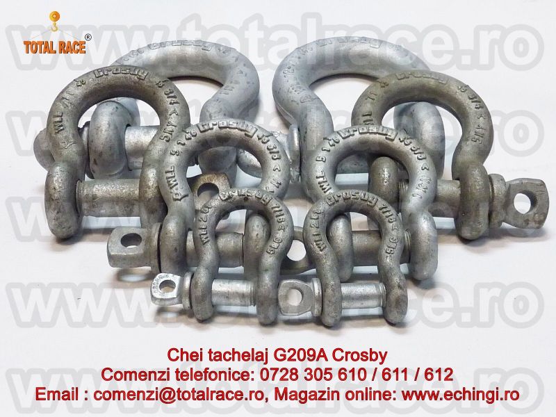 Total Race comercializeaza : chei tachelaj model G 209A tip omega marca Crosby, cheie tachelaj cu bolt filetat , chei tachelaj capacitati intre 2 Tone si 21 Tone . Cheile de tachelaj sunt in conformitate cu cerintele de performanta ale Fed. Spec. RR-C271D tip IVA, grad A, Clasa 2, ASME B30.26 . Chei de tachelaj cu factor de siguranta: MBL = 4,5 x WLL (Sarcina maxima de lucru) , cheie tachelaj: Forjat- Calit si Temperat - Material otel aliat , galvanizata la cald . Capacitatea stantata permanent pe shackles. Cheile de tachelaj Crosby® se livreaza cu certificate de calitate CE de la producator. Pentru detalii accesati: www.echingi.ro & www.cheitachelaj.ro