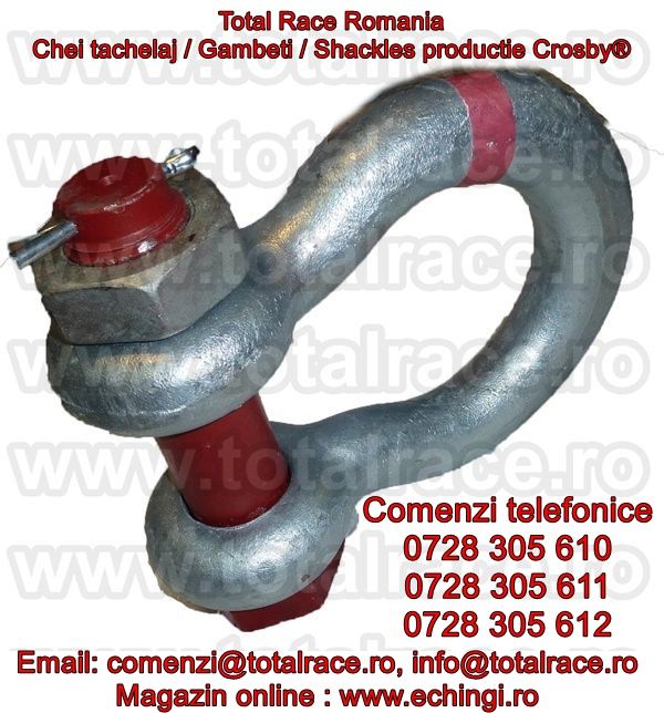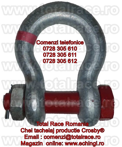Total Race ofera la vanzare : chei tachelaj model G 209 tip omega marca Crosby, cheie tachelaj cu bolt filetat , chei tachelaj capacitati intre 0.33 Tone si 55 Tone . Cheile de tachelaj sunt in conformitate cu: EN 13889:2003 , indeplinesc cerintele de performanta ale Fed. Spec. RR-C271D tip IVA, grad A, Clasa 2. Chei de tachelaj cu factor de siguranta: MBL = 6 x WLL (Sarcina maxima de lucru) , cheie tachelaj: Forjat- Calit si Temperat - Material otel aliat , galvanizata la cald . Capacitatea stantata permanent pe shackles. Cheile de tachelaj peste capacitate WLL= 25 Tone sunt echipate RFID.Cheile de tachelaj Crosby® se livreaza cu certificate de calitate CE de la producator. Pentru detalii accesati: www.echingi.ro & www.cheitachelaj.ro