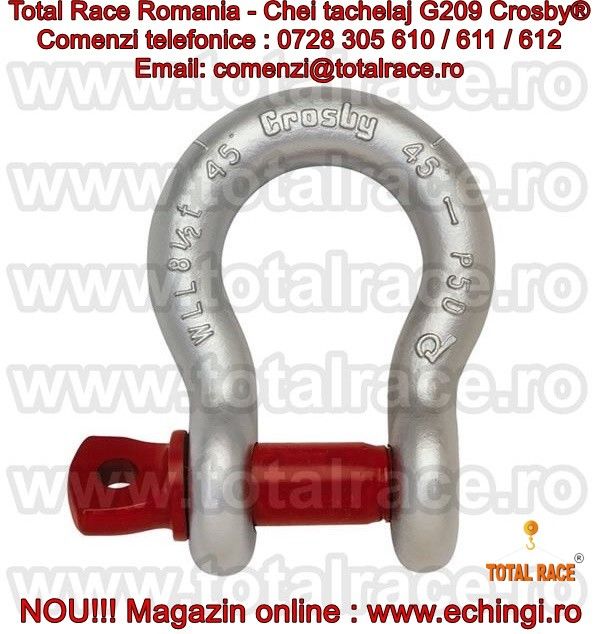 - Total Race comercializeaza cu livrare din stoc Bucuresti: chei tachelaj model G 209 tip omega marca Crosby, cheie tachelaj cu bolt filetat , chei tachelaj capacitati intre 0.33 Tone si 55 Tone . Cheile de tachelaj sunt in conformitate cu: EN 13889:2003 , indeplinesc cerintele de performanta ale Fed. Spec. RR-C271D tip IVA, grad A, Clasa 2. Chei de tachelaj cu factor de siguranta: MBL = 6 x WLL (Sarcina maxima de lucru) , cheie tachelaj: Forjat- Calit si Temperat - Material otel aliat , galvanizata la cald . Capacitatea stantata permanent pe shackles. Cheile de tachelaj peste capacitate WLL= 25 Tone sunt echipate RFID. Cheile de tachelaj Crosby® se livreaza cu certificate de calitate CE de la producator. Pentru detalii accesati: www.echingi.ro & www.cheitachelaj.ro